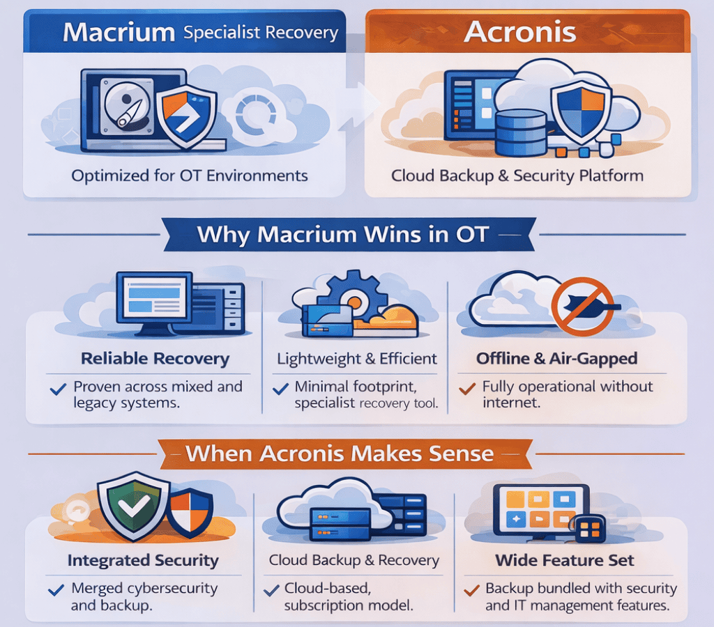 If the priority is deterministic imaging and predictable recovery in offline or long-lifecycle environments, Macrium is usually the more natural fit. Fewer moving parts in the restore path means more confidence when recovery actually matters.